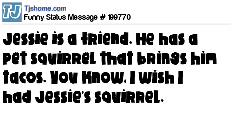 X is Jessie is a friend. He has a pet squirrel that brings him tacos. You know, I wish I had Jessie's squirrel.