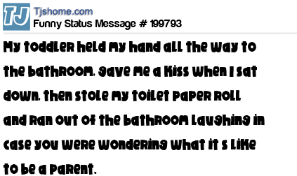 X says My toddler held my hand all the way to the bathroom, gave me a kiss when I sat down, then stole my toilet paper roll and ran out of the bathroom laughing in case you were wondering what it’s like to be a parent.