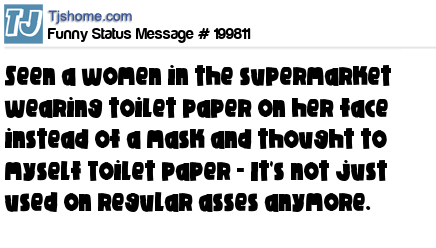 X is Seen a women in the supermarket wearing toilet paper on her face instead of a mask and thought to myself Toilet paper - It's not just used on regular asses anymore.