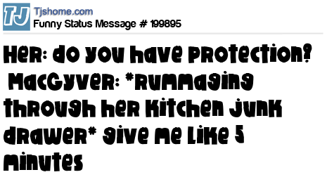 X says Her: do you have protection? MacGyver: *rummaging through her kitchen junk drawer* give me like 5 minutes