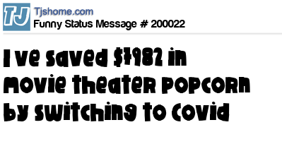 - # 201146 I've done the calculations. So far this year I've saved just short of $3600 from not having to buy Movie theatre Popcorn. I hope they don't have to raise the prices in 2021.