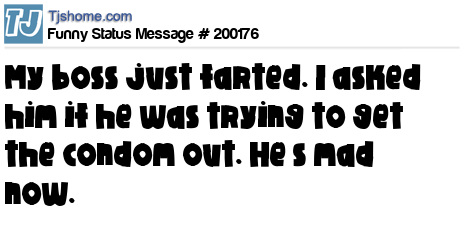 X says My boss just farted. I asked him if he was trying to get the condom out. He’s mad now.