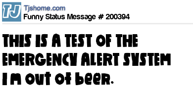- # 90672 THIS IS A TEST OF THE EMERGENCY ALERT SYSTEM I'm out of beer.