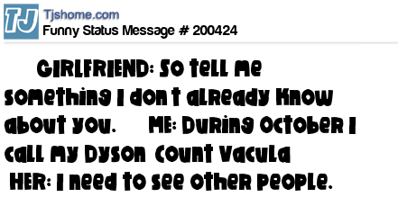 X says GIRLFRIEND: So tell me something I don’t already know about you. ME: During October I call my Dyson ‘Count Vacula’ HER: I need to see other people.