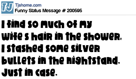 X says I find so much of my wife’s hair in the shower, I stashed some silver bullets in the nightstand. Just in case.