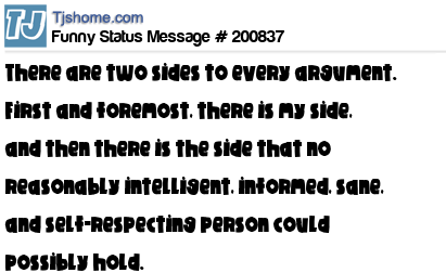 X says There are two sides to every argument. First and foremost, there is my side, and then there is the side that no reasonably intelligent, informed, sane, and self-respecting person could possibly hold.