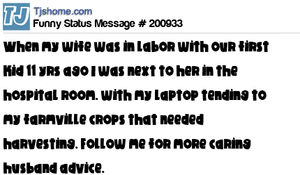 X says when my wife was in labor with our first kid 11 yrs ago I was next to her in the hospital room. with my laptop tending to my farmville crops that needed harvesting. Follow me for more caring husband advice.