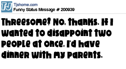 - # 134565 A threesome? Nah not for me. If I wanted to horribly disappoint two other people I'd go out to dinner with my parents.