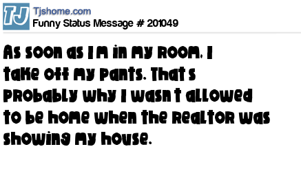 X says As soon as I’m in my room, I take off my pants. That’s probably why I wasn’t allowed to be home when the realtor was showing my house.