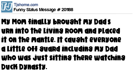 X says My Mom finally brought my Dad’s urn into the living room and placed it on the mantle. It caught everyone a little off guard including my Dad who was just sitting there watching Duck Dynasty.