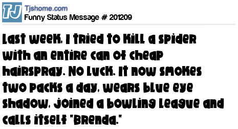X says Last week, I tried to kill a spider with an entire can of cheap hairspray. No luck. It now smokes two packs a day, wears blue eye shadow, joined a bowling league and calls itself "Brenda."