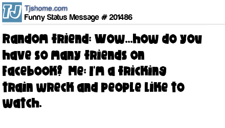 X Random friend: Wow...how do you have so many friends on Facebook? Me: I'm a fricking train wreck and people like to watch.