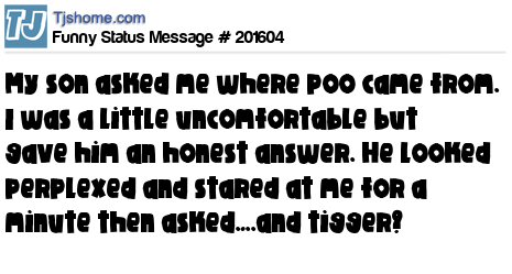 X says My son asked me where poo came from. I was a little uncomfortable but gave him an honest answer. He looked perplexed and stared at me for a minute then asked….and tigger?