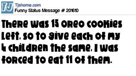 X says There was 15 Oreo cookies left, so to give each of my 4 children the same, I was forced to eat 11 of them.