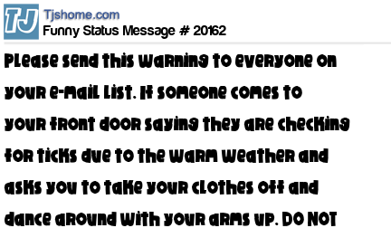 - # 38169 WARNING!PLEASE READ!!! If someone comes to your door and ask you to take off your clothes and dance around with your hands in the air....DO NOT DO THIS! This is a scam.....they just want to see you naked! Please copy and paste this as your status! I wish