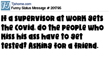 X says If a supervisor at work gets the Covid, do the people who kiss his ass have to get tested? Asking for a friend.