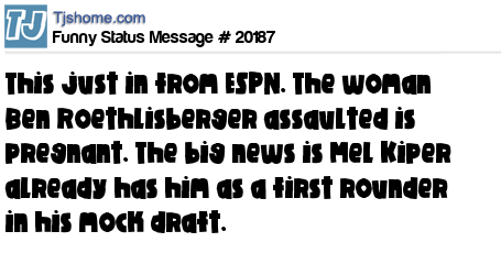 X This just in from ESPN. The woman Ben Roethlisberger assaulted is pregnant. The big news is Mel Kiper already has him as a first rounder in his mock draft.