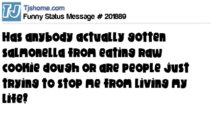 - # 193965 Has anybody ever actually gotten salmonella from eating raw cookie dough or are people just trying to stop me from living my life?