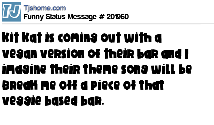 X is Kit Kat is coming out with a vegan version of their bar and I imagine their theme song will be Break me off a piece of that veggie based bar.