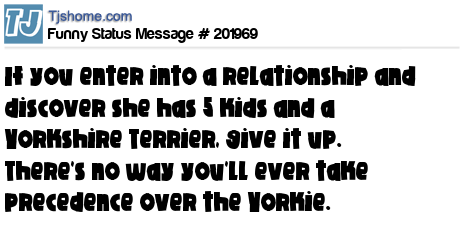 - # 207949 If you enter into a relationship and discover she has 5 kids and a Yorkshire Terrier, give it up. There's no way you'll ever win out over the Yorkie.