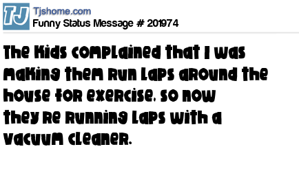 X says The kids complained that I was making them run laps around the house for exercise, so now they’re running laps with a vacuum cleaner.