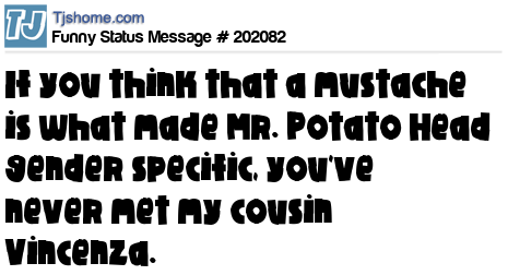 X says If you think that a mustache is what made Mr. Potato Head gender specific, you've never met my cousin Vincenza.