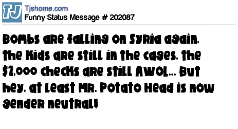 X says Bombs are falling on Syria again, the kids are still in the cages, the $2,000 checks are still AWOL... But hey, at least Mr. Potato Head is now gender neutral!