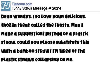 X Dear Wendy's, I so love your delicious, frozen treat called the Frosty. May I make a suggestion? Instead of a plastic straw, could you please substitute this with a bamboo straw? I'm tired of the plastic straws collapsing on me.