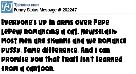 X says Everyone's up in arms over Pepe LePew romancing a cat. Newsflash: Most men are skunks and we romance pu$$y. Same difference. And I can promise you that trait isn't learned from a cartoon.