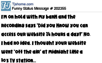X says I'm on hold with my bank and the recording says "Did you know you can access our website 24 hours a day?" No, I had no idea. I thought your website went "off the air" at midnight like a 70's TV station...
