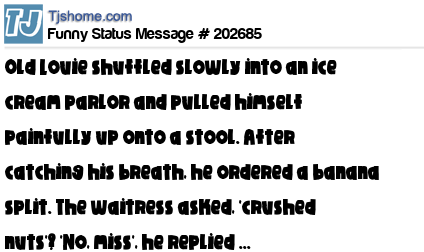 - # 74998 A little old man shuffled slowly into an ice cream parlor and pulled himself slowly, painfully, up onto a stool. After catching his breath he ordered a banana split. The waitress asked, "Crushed nuts?" " He goes, "No, arthritis."