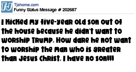 X is I kicked my five-year old son out of the house because he didn't want to worship Trump. How dare he not want to worship the man who is greater than Jesus Christ. I have no son!!!