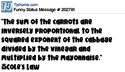 X says "The sum of the carrots are inversely proportional to the squared exponent of the cabbage divided by the vinegar and multiplied by the mayonnaise." ~Cole's Law