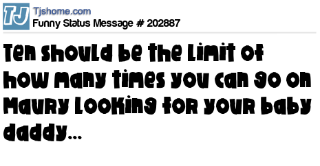 - # 60968 10 should be the limit of how many times you can go on Maury looking for your baby daddy... just sayin'