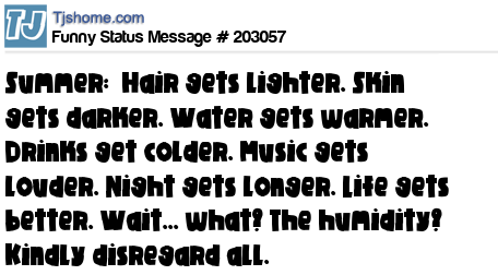 X says Summer:  Hair gets lighter. Skin gets darker. Water gets warmer. Drinks get colder. Music gets louder. Night gets longer. Life gets better. Wait... what? The humidity?  Kindly disregard all.