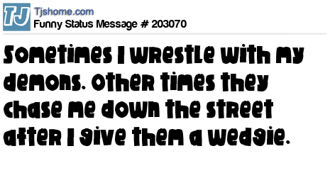 X says Sometimes I wrestle with my demons. Other times they chase me down the street after I give them a wedgie.