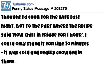 X is Thought I'd cook for the wife last night. Got to the part where the recipe said "Now chill in fridge for 1 hour". I could only stand it for like 20 minutes - it was cold and really crowded in there....