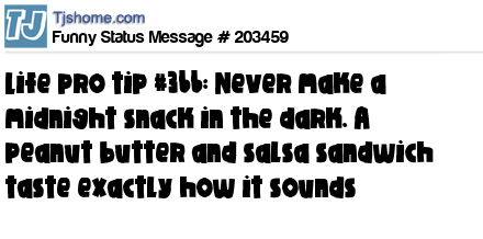 - # 203006 Life pro tip #366: Never make a midnight snack in the dark. A peanut butter and salsa sandwich taste exactly how it sounds...