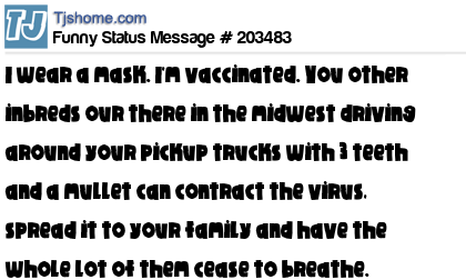 X is I wear a mask. I'm vaccinated. You other inbreds our there in the midwest driving around your pickup trucks with 3 teeth and a mullet can contract the virus, spread it to your family and have the whole lot of them cease to breathe.