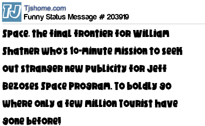X is Space, the final frontier for William Shatner who's 10-minute mission to seek out stranger new publicity for Jeff Bezoses Space Program. To boldly go where only a few million Tourist have gone before!