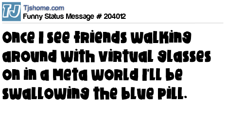 X is Once I see friends walking around with virtual glasses on in a Meta world I'll be swallowing the blue pill.