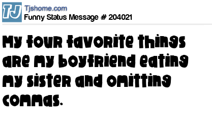 X says My four favorite things are my boyfriend eating my sister and omitting commas.