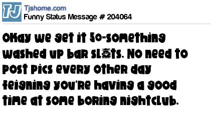 X says Okay we get it 50-something washed up bar sl~ts. No need to post pics every other day feigning you're having a good time at some boring nightclub.
