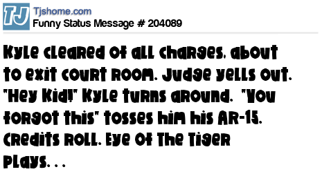 X says Kyle cleared of all charges, about to exit court room. Judge yells out. "Hey Kid!" Kyle turns around. "You forgot this" tosses him his AR-15. Credits roll. Eye Of The Tiger plays. . .