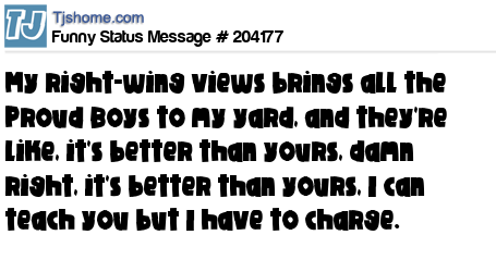 X is My right-wing views brings all the Proud Boys to my yard, and they're like, it's better than yours, damn right, it's better than yours, I can teach you but I have to charge.