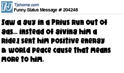 - # 119854 I saw a guy in a Prius run out of gas... instead of giving him a ride,, I sent him positive energy & world peace cause that means more to him.