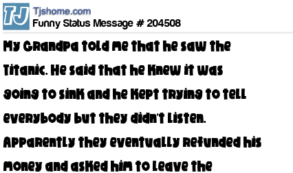 X says My Grandpa told me that he saw the Titanic. He said that he knew it was going to sink and he kept trying to tell everybody but they didn't listen. Apparently they eventually refunded his money and asked him to leave the theater.