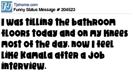 X says I was tilling the bathroom floors today and on my knees most of the day, now I feel like Kamala after a job interview.