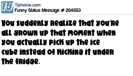 - # 123592 Damn, You suddenly realize that you're all grown up that moment when you actually pick up the ice cube instead of kicking it under the fridge.