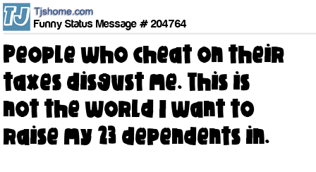 - # 208722 People who cheat on their taxes disgust me...this is not the world I want to raise my 32 dependents in! 😉